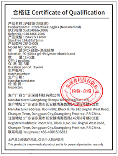 Goggles (without ventilation holes) Qualification: formal record, complete qualification